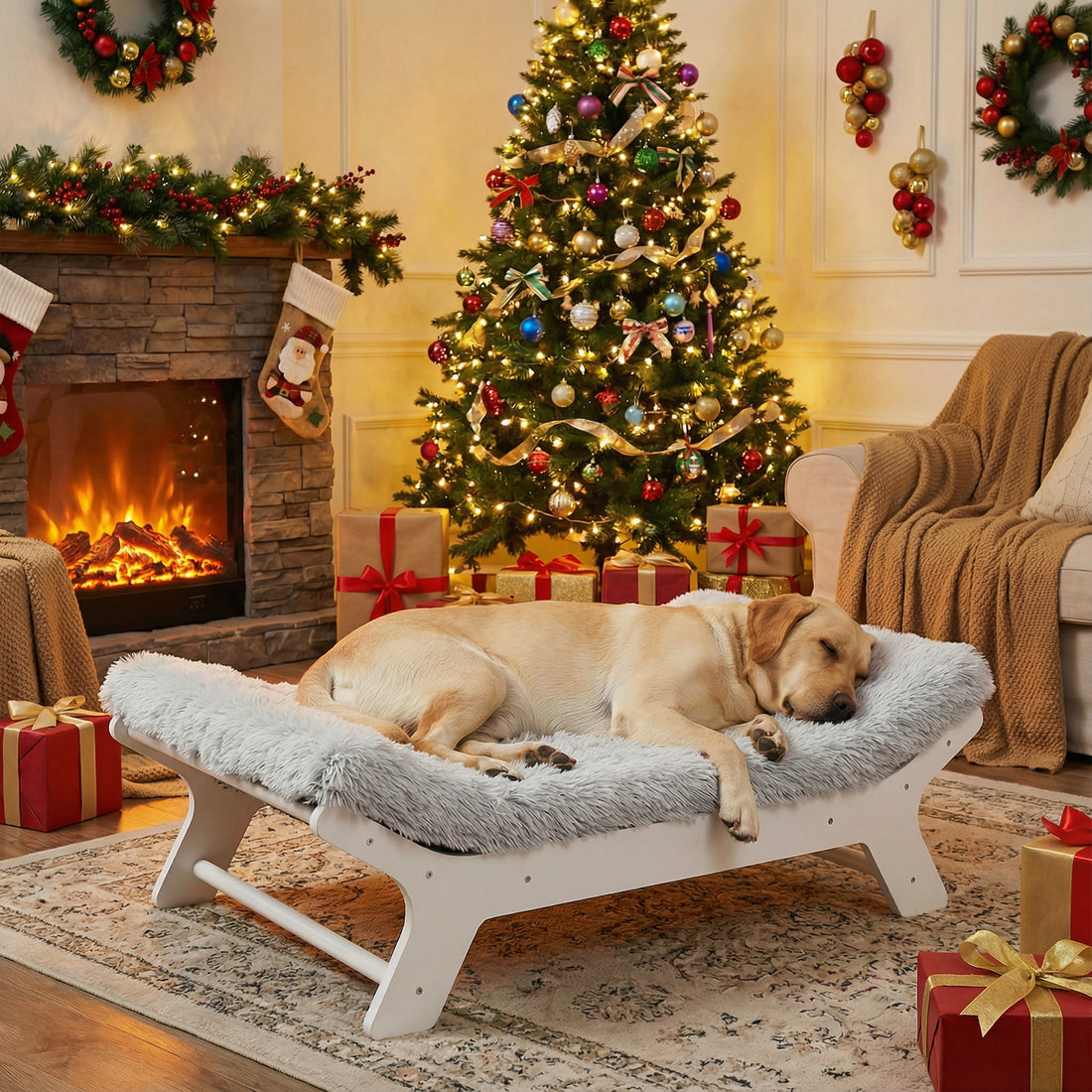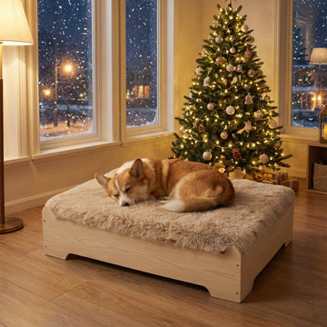 Bought this for the holiday season and it fits perfectly with my décor. The elevated design keeps my pup warm and comfy, especially near the fireplace. He looks like a little king lounging on it! Worth every penny.